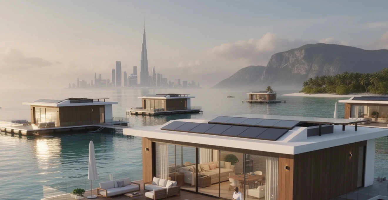 À l’opposé des îles naturelles du Pacifique, Dubaï et les Émirats Arabes Unis incarnent une vision résolument futuriste de l’immobilier flottant. Le projet The World Islands, archipel artificiel reproduisant la carte du monde, accueille déjà plusieurs concepts de villas et de palaces flottants, dont le Kempinski Floating Palace. Sur le projet Heart of Europe, des « villas flottantes » avec niveaux sous-marins permettent d’observer la faune marine depuis une chambre panoramique immergée, reprenant le principe des suites sous-marines tout en l’intégrant à un produit immobilier commercialisable.